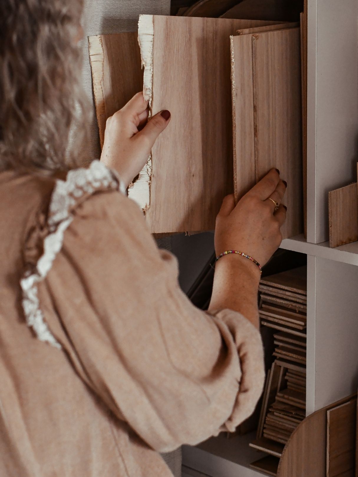 Je sélectionne des chutes de bois d’eucalyptus. J’utilise des filaments d’impression 3D recyclés, issus de fibres végétales (amidon de maïs).